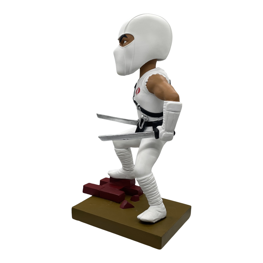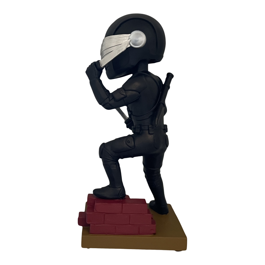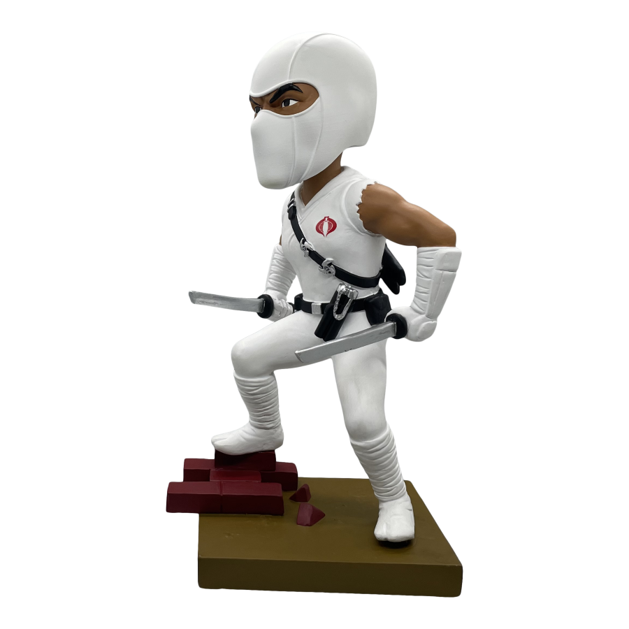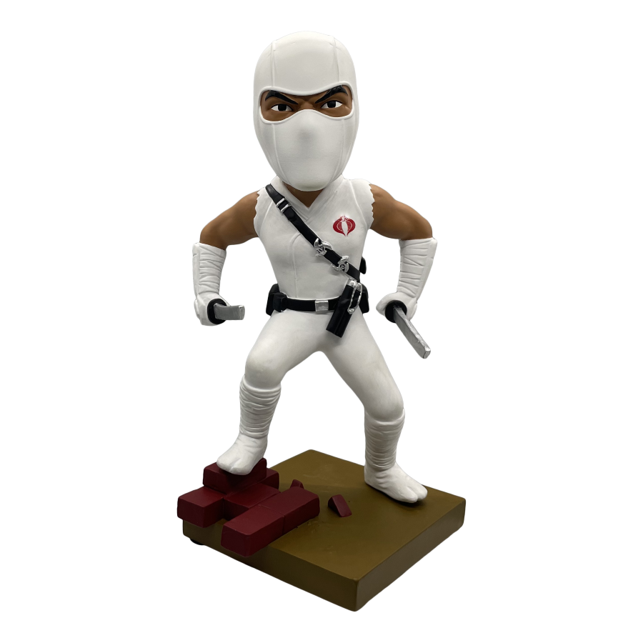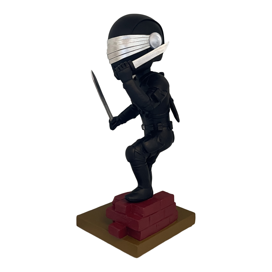 Armed with swords in each hand, Storm Shadow stands atop a diorama base ready to battle the Joes. Each limited edition bobblehead is made of polystone and hand painted. Connect and display alongside the Snake Eyes Bobblehead for a G.I. Joe themed diorama!