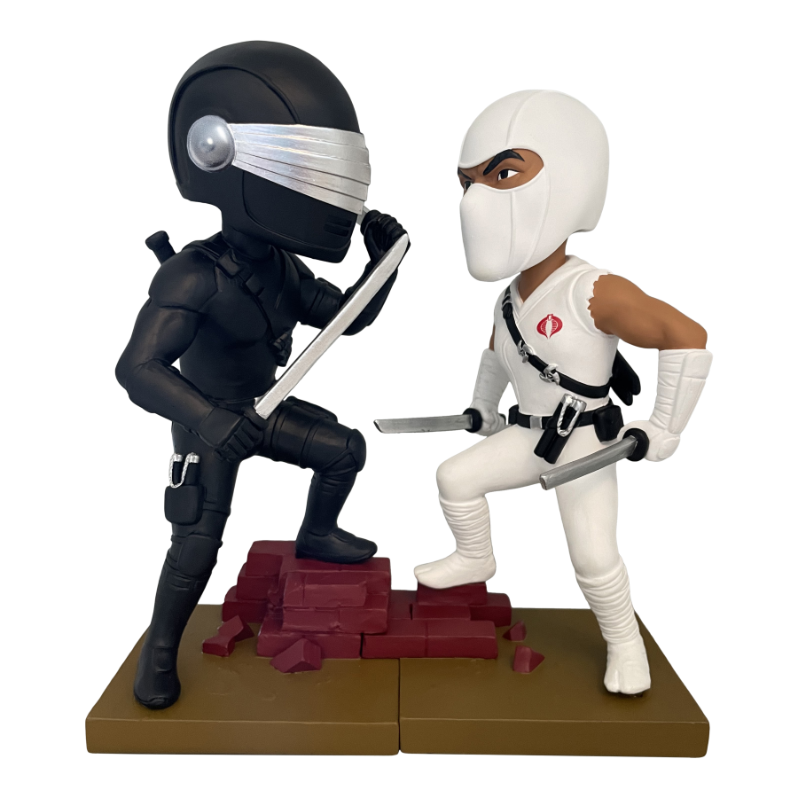 Armed with swords in each hand, Snake Eyes stands atop a diorama base ready to battle Cobra. Each limited edition bobblehead is made of polystone and hand painted. Connect and display alongside the Storm Shadow Bobblehead for a G.I. Joe themed diorama!