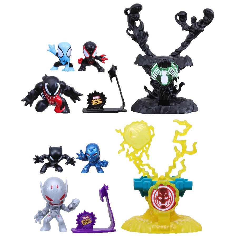 Mighty heroes, mega attitude! The Marvel Stunt Squad Spider-Man and Miles Morales vs Venom Villain Knockdown Playset is a gamified action figure set that kids ages 4 and up will love. Featuring favorite Marvel characters in a classic hero versus villain play, these small-scale superhero figures are full of action-packed fun! This Marvel Stunt Squad Villain Knockdown Playset includes Spider-Man and Miles Morales 1-inch-scale super hero action figures, a deluxe Venom villain figure, a launcher, and a destructible target base that kids can rebuild to discover multiple ways to take down the bad guys.