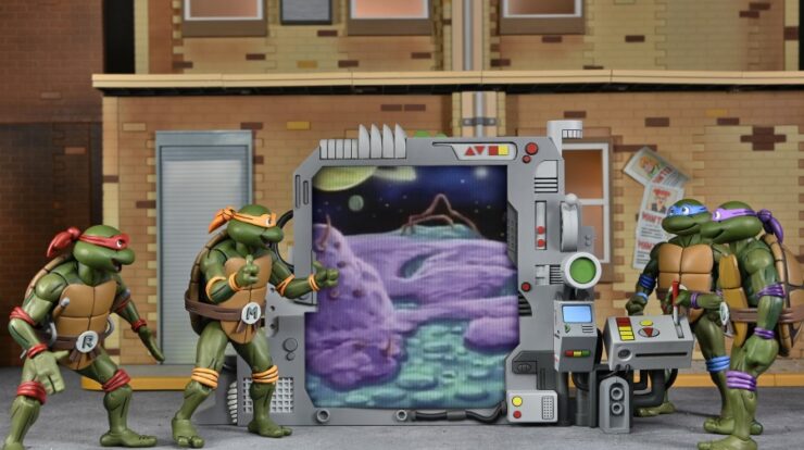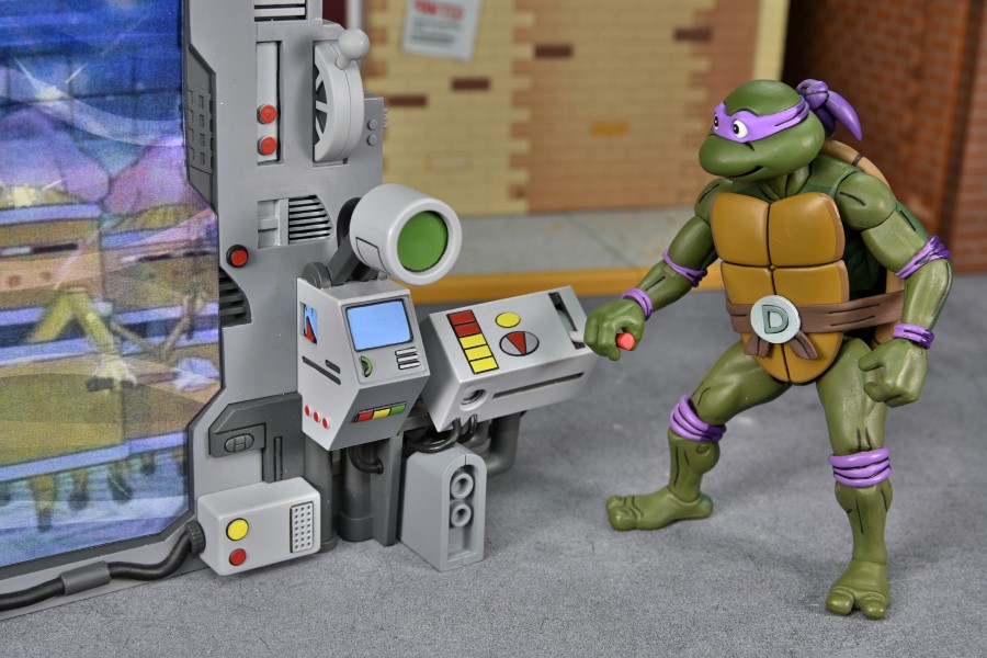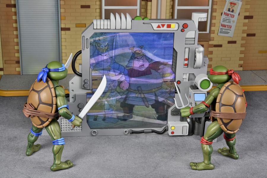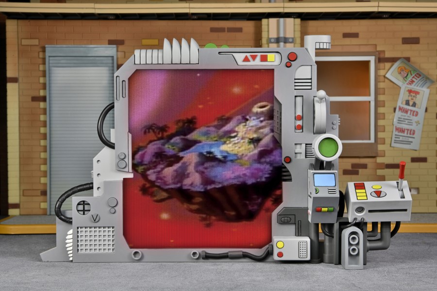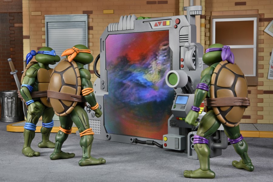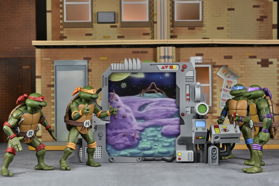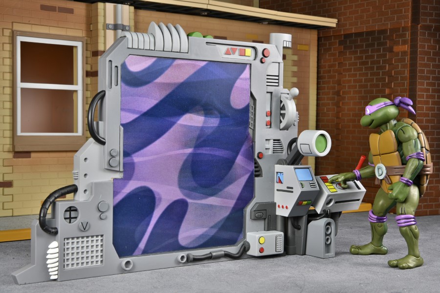 Standing in 7” scale, it features three interchangeable lenticular screens, allowing your Turtles to visit different locations — even alternate dimensions, just like in the cartoon! The piece is carefully detailed to look just like the one in the series, and even has an articulated lever. Comes in slick packaging that pays tribute to the original VHS home releases. Measures approximately 7.25 inches high. Action figures and other accessories not included.