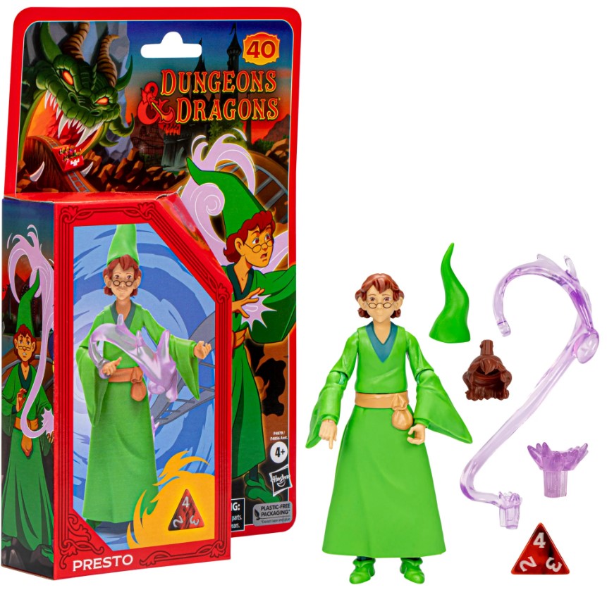 Hey, look! A Dungeons & Dragons toy! These 6-inch-scale Cartoon Classics figures will have you saying “Wow, neat!” before you’re figuratively transported to realms of danger and adventure (because imagination!) … and these collectible figures are transported to your shelf by you buying them and bringing them home. This Presto action figure contains magic hat and magic blast effect accessories and a d4 that’s exclusive to this Cartoon Classics figure. With packaging inspired by the original cartoon artwork, these collectible figures will look great on your shelf, in or out of the box. Available for pre-order NOW at Hasbro Pulse and most major toy retailers.
