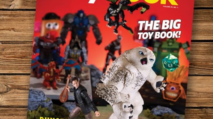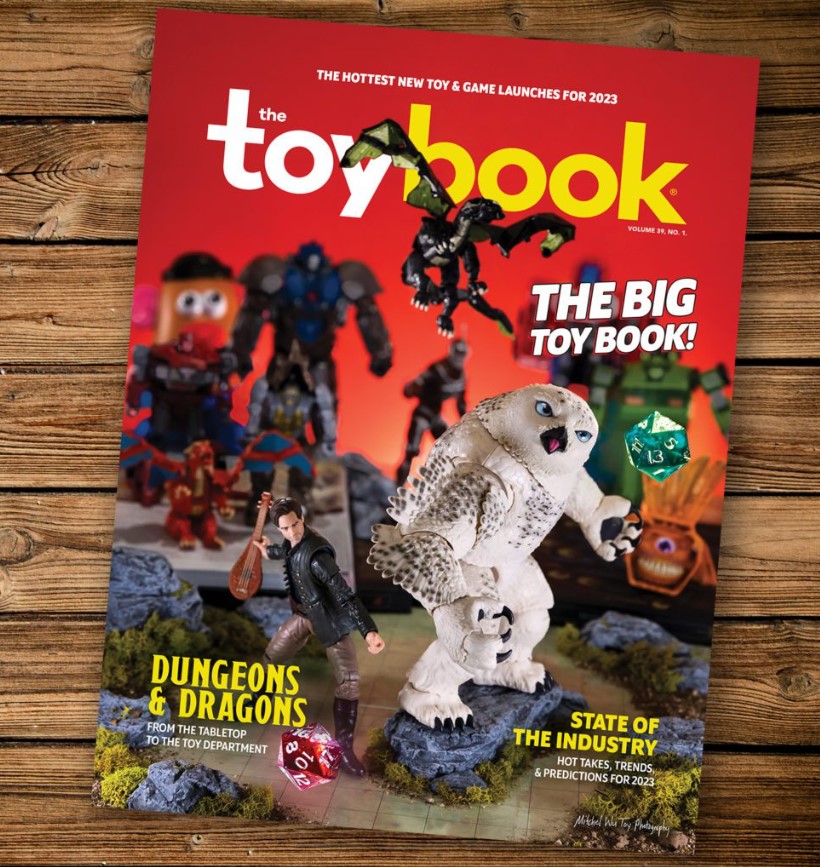 Crafted by Mitchel Wu Toy Photography, the Toy Book cover is designed to capture the theme of the cover story, “Dungeons & Dragons: From the Tabletop to the Toy Department.” The Owlbear stands tall alongside Edgin the Bard atop D&D campaign materials. In the background, eagle-eyed readers may catch some Easter eggs, including Autobots and Decepticons from this summer’s Transformers: Rise of the Beasts.
