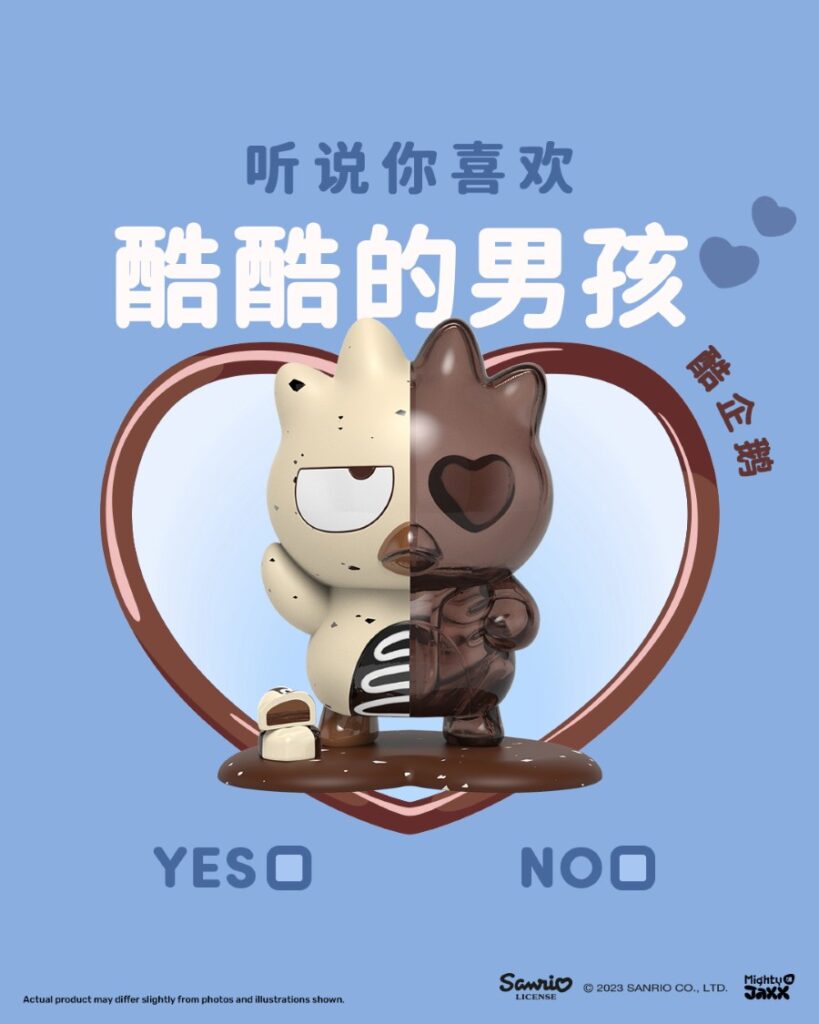 - Bad-Badtz Maru: The lovable, ambitious penguin takes on the cookies and cream chocolate flavor! One half is styled in white chocolate with bits of cookie crumble while the other is sweet milk chocolate.