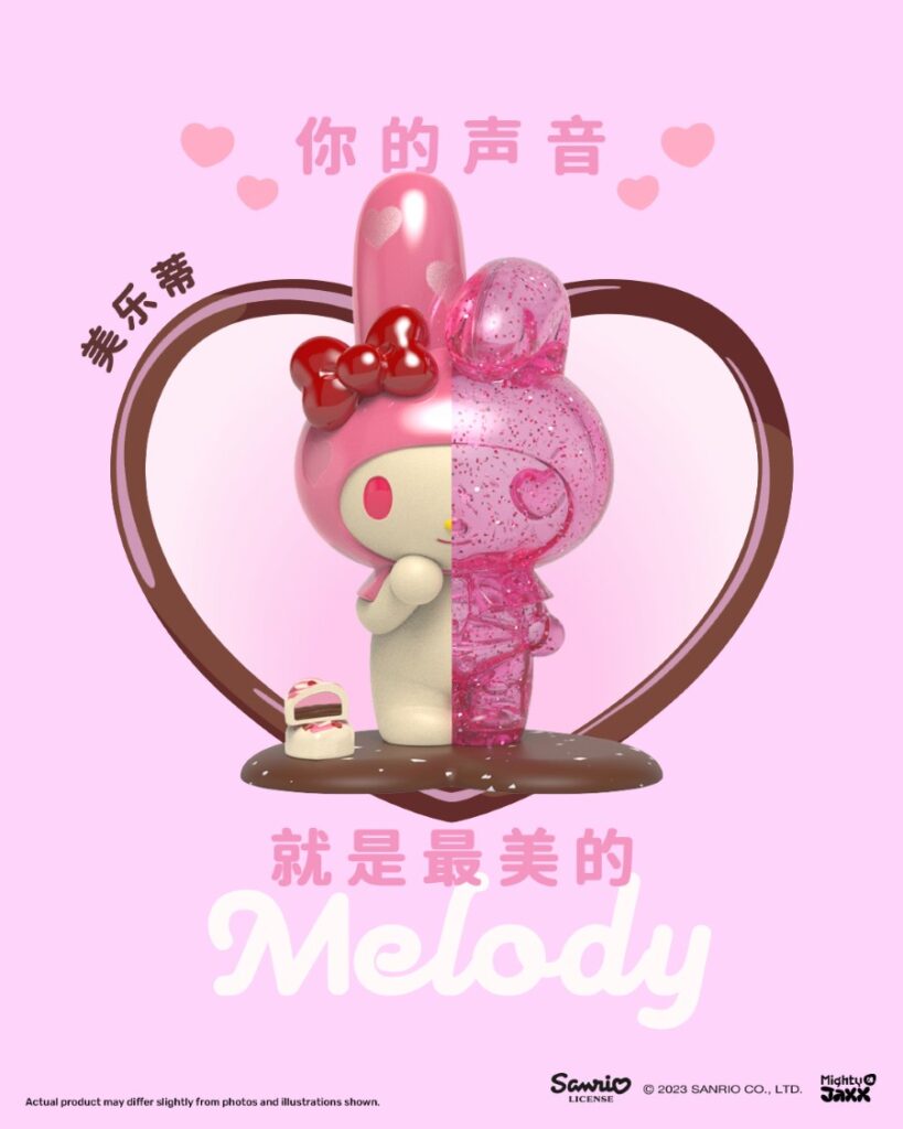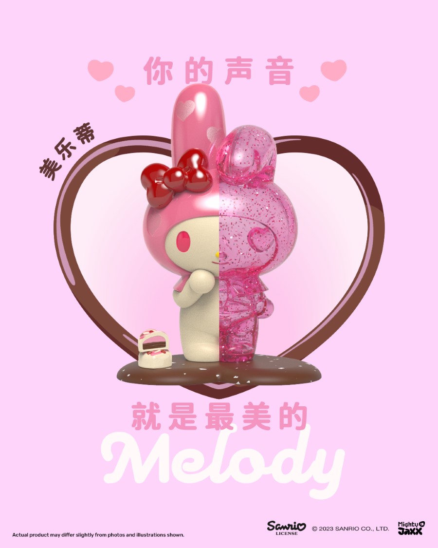 - My Melody: This series’ ultra-rare piece: My Melody! The strawberry milk-flavored treats are detailed with shimmery strawberry hearts, a glossy strawberry syrup bow, and a glittery dissected half—making her look as good as she might taste!
