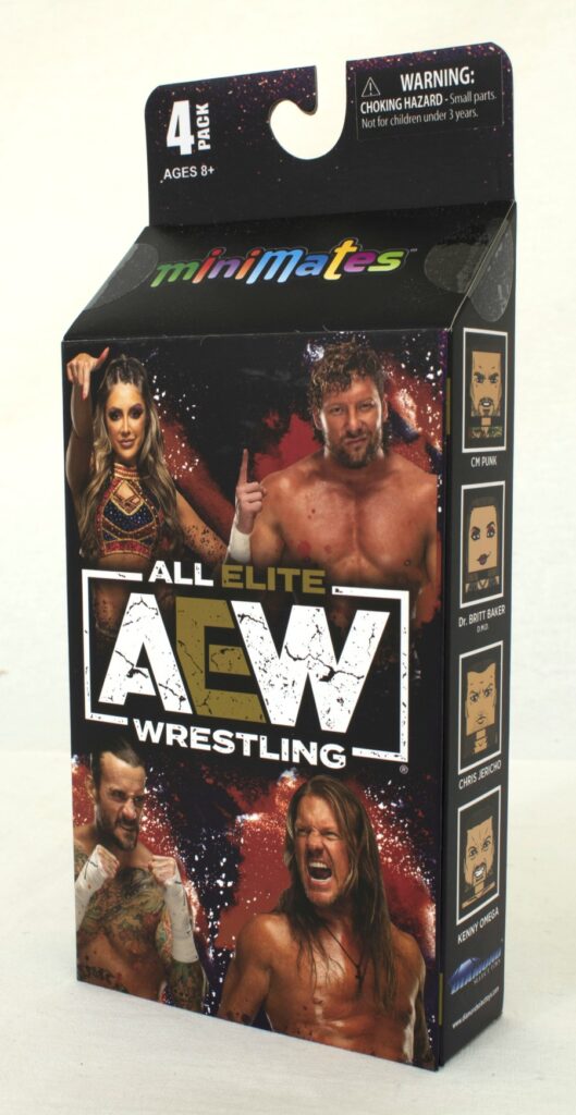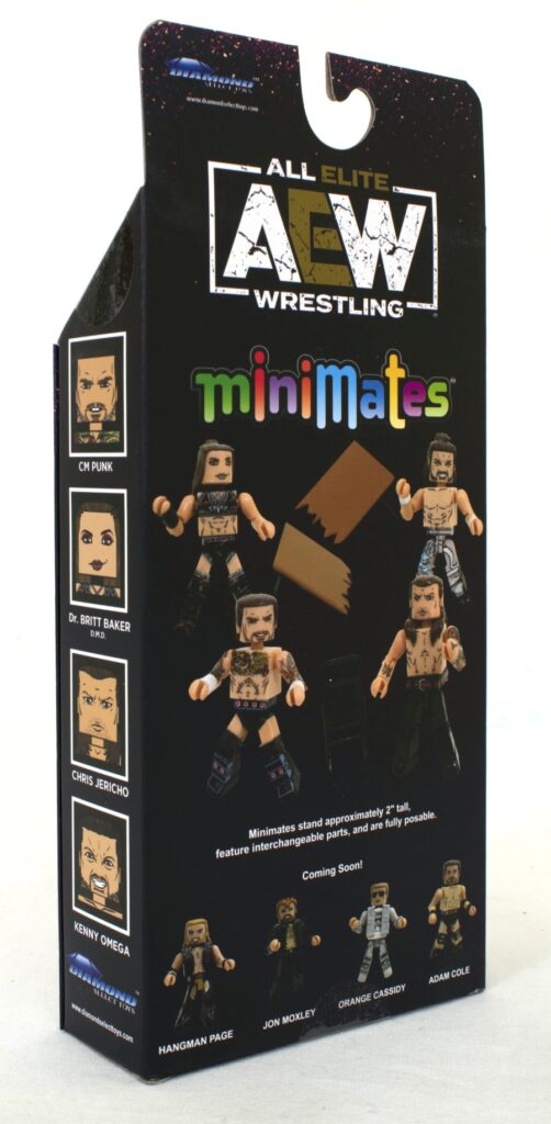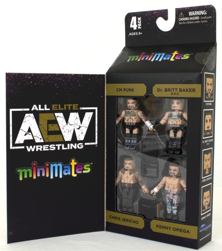 Series 1 of Minimates includes former champions Kenny Omega, Chris Jericho, CM Punk and Dr. Britt Baker, DMD, each standing 2 inches tall with 14 points of articulation and fully interchangeable parts. Accessories include a barbed-wire baseball bat, a folding chair, a chain and a breakaway table! It comes packaged in a full-color window box with opening fifth panel flap.