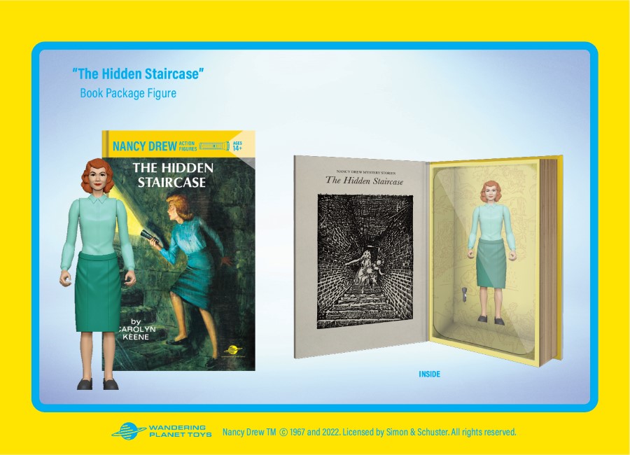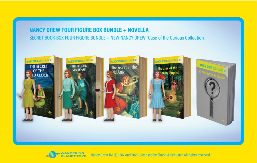 For more than 90 years Nancy Drew has starred in hundreds of books and graphic novels and has been the subject of no less than six feature films (from 1938’s Nancy Drew… Detective to 2019’s Nancy Drew and the Hidden Staircase). She’s had TV shows in the 1970s, 1990s, and a series currently airing on the CW. But, curiously, she’s never had an official line of action figures… Now, with a license from Simon & Schuster, Wandering Planet Toys is launching a Kickstarter campaign to fund the first-ever officially licensed action figure line, featuring 4-inch retro style collectible figures based on the classic Nancy Drew book cover art by celebrated artist Rudy Nappi.