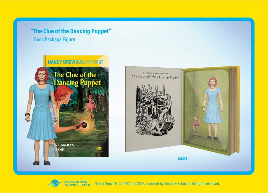 THE CLUE OF THE DANCING PUPPET Secret Book-Box Collectible Figure is based on book #39 and will not only feature jewelry details and a flashlight accessory but will also be accompanied by a spooky faceless dancing puppet that will likely appear to Nancy mysteriously during the night!