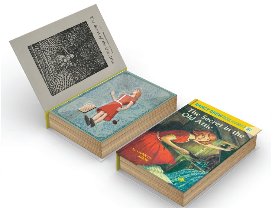 The NANCY DREW AND THE HIDDEN STAIRCASE Secret Book-Box Collectible Figure is based on the second book in the series and features Nancy’s long sleeve top and skirt outfit, and includes a flashlight accessory so that Nancy can see as she climbs the darkened stairs in the crumbling colonial mansion of Twin Elms.