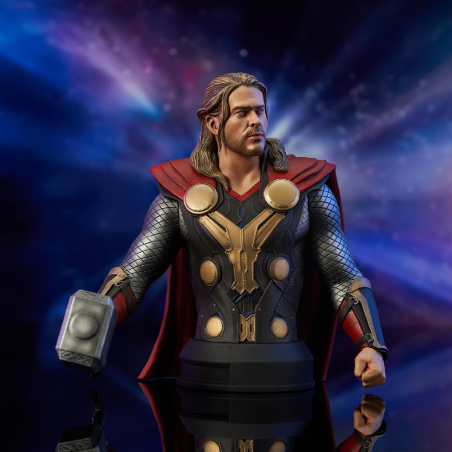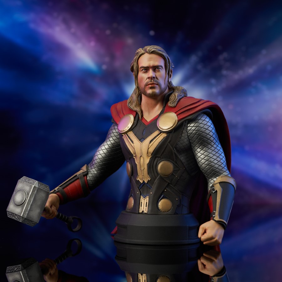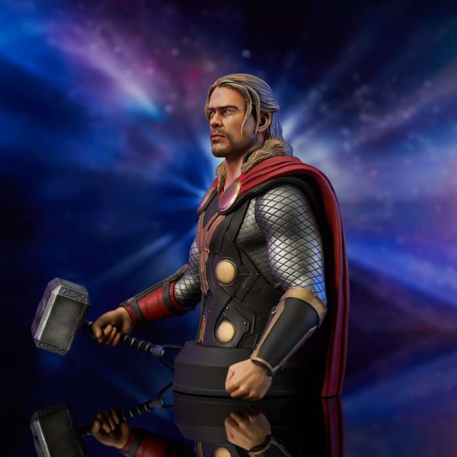 A Gentle Giant LTD release! Return to the Dark World! Inspired by his appearance in the second Thor movie, this 1/6 scale mini-bust of the Odinson himself depicts him in his traditional garb, his hammer Mjolnir in hand. Measuring approximately 6 inches tall atop a pedestal base, this detailed portrait is limited to only 3,000 pieces, and comes packaged in a full-color box with a numbered certificate of authenticity. Designed by the Silva Bros. sculpted by Joe Menna! SRP: $130.00