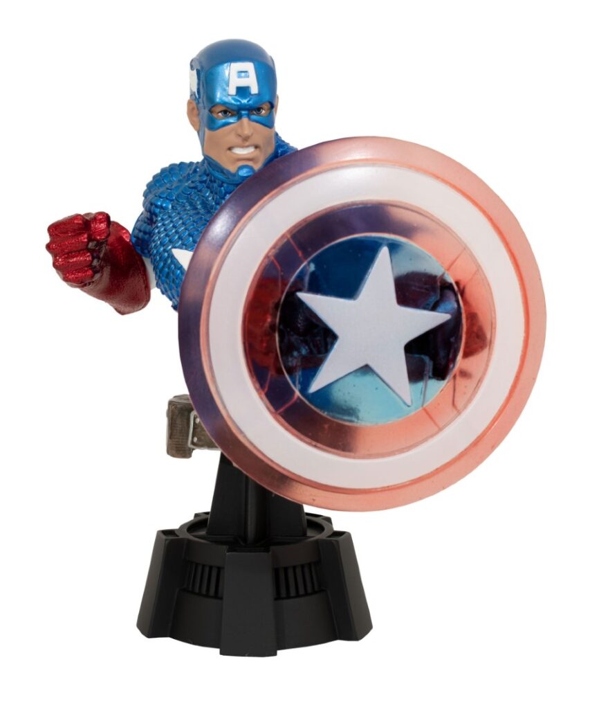 A Diamond Select Toys release! Captain America is ready to show off his big, big energy! As seen in the 2000s issues of his solo series, when his vibranium shield was shattered, Captain America wields his SHIELD-supplied energy shield in this new variant mini-bust! With a metallic sheen to his costume and a translucent resin shield to allow the light to pass through, this 1/7 scale mini-bust stands approximately 6 inches tall and is limited to only 500 pieces. It comes packaged in a full-color box with a numbered certificate of authenticity. Designed by Nelson X. Asencio, sculpted by Juan Pitluk! SRP: $70.00