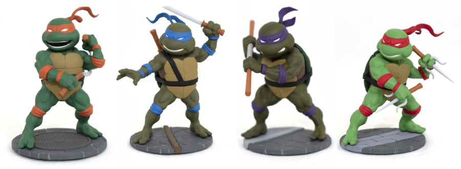 A Diamond Select Toys release! Cowabunga! The turtles re-unite in this exclusive box set! Featuring 3-inch vinyl figurines of the four turtles in their classic red, orange, blue and purple bandannas, they each come packaged on full-color blister card, inside a miniature pizza box! Limited to only 1,500 pieces. Figures designed by Barry Bradfield, sculpted by Rocco Tartamella! SRP: $40.00