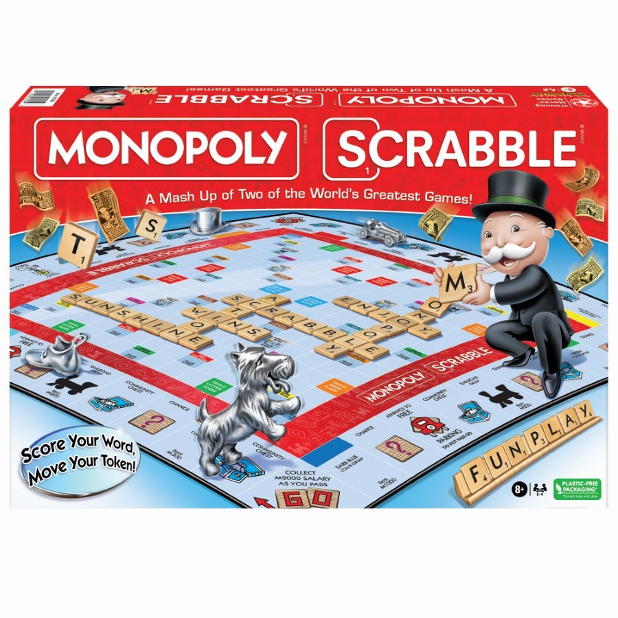 Under license from Hasbro, a toy and game company, Winning Moves Games USA is excited to introduce MONOPOLY® SCRABBLE®. This innovative new game combines the best elements of the MONOPOLY® game with the crossword-building play of SCRABBLE®. In place of rolling dice to move around the board, players build words and move ahead according to their score. Build a word on a premium space and claim a MONOPOLY® property.