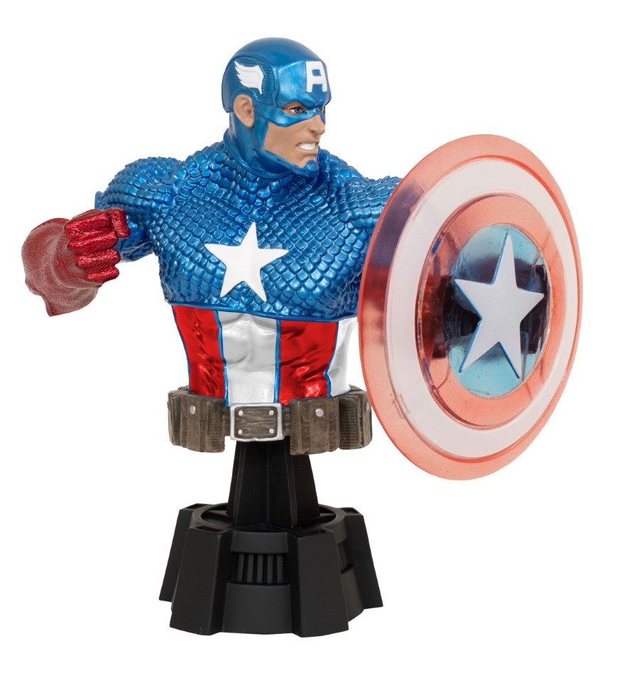 A Diamond Select Toys release! Captain America is ready to show off his big, big energy! As seen in the 2000s issues of his solo series, when his vibranium shield was shattered, Captain America wields his SHIELD-supplied energy shield in this new variant mini-bust! With a metallic sheen to his costume and a translucent resin shield to allow the light to pass through, this 1/7 scale mini-bust stands approximately 6 inches tall and is limited to only 500 pieces. It comes packaged in a full-color box with a numbered certificate of authenticity. Designed by Nelson X. Asencio, sculpted by Juan Pitluk! SRP: $70.00