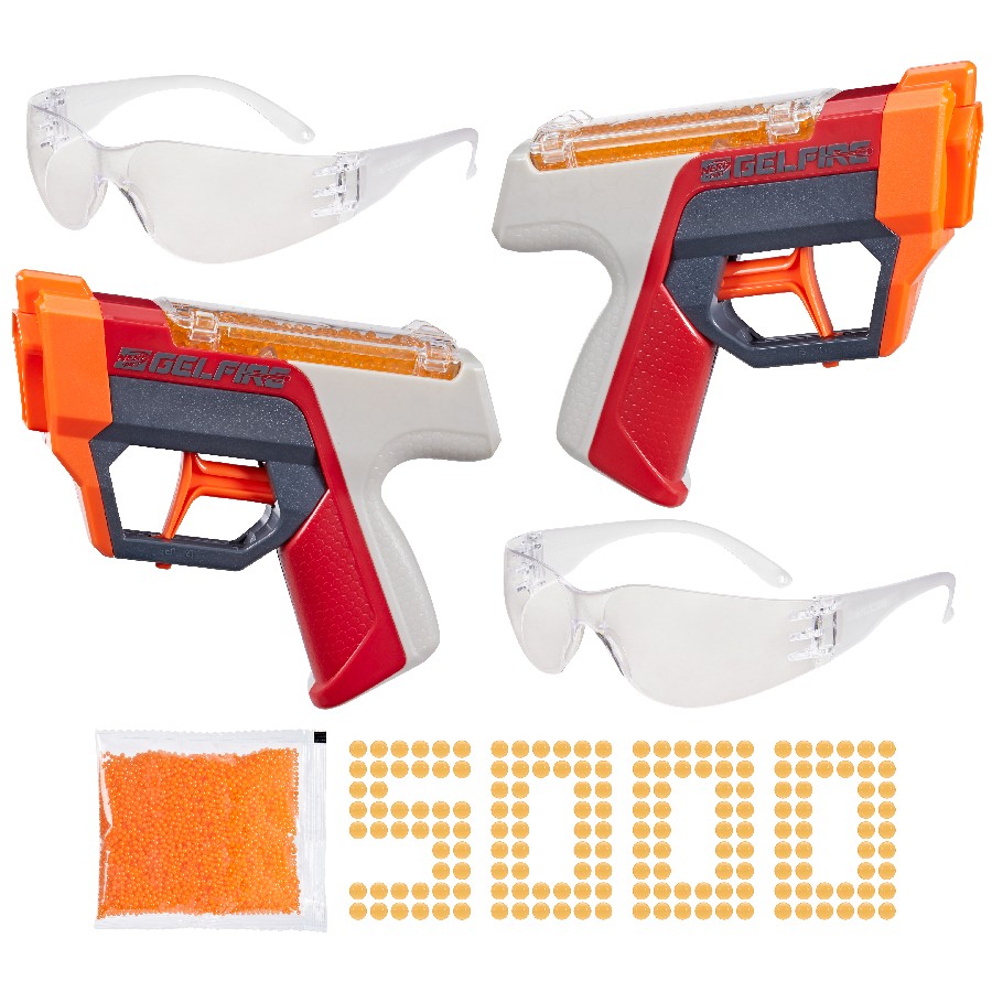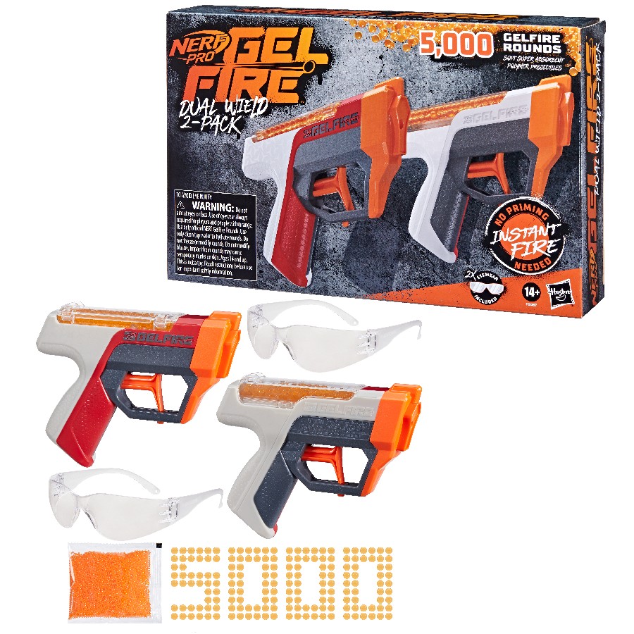 Burst into battle with NERF PRO GELFIRE blasters featuring Gelfire rounds, hydrated rounds that burst on impact! These massive-capacity blasters deliver high-performance blasting to ignite your competitive advantage. NERF PRO GELFIRE rounds come dehydrated in the box, giving you a huge amount of rounds for multiple refills. Add water to hydrate the rounds to prepare them for use. The hydrated rounds fire from the blaster at a high velocity and burst when they hit a target. No need to pick up rounds! The NERF PRO GELFIRE DUAL WIELD PACK includes 2 blasters that feature instant firing, no priming needed! Simply pull the trigger to fire rounds. You can hold and fire a blaster in each hand for a double-fisted battle advantage in competitive outdoor games. Fire as fast as you can pull the trigger! Each blaster has a 100-round capacity integrated hopper for easy fill and high capacity. Includes 5,000 dehydrated NERF PRO GELFIRE soft super absorbent polymer projectiles, 2 pairs of certified protective eyewear, and trigger lock. No batteries needed. The quality design provides durability for competitive Gelfire games. Outdoor use recommended. Available for purchase at most major retailers, including Walmart, Target and Amazon, starting July 2023. #PlayResponsibly