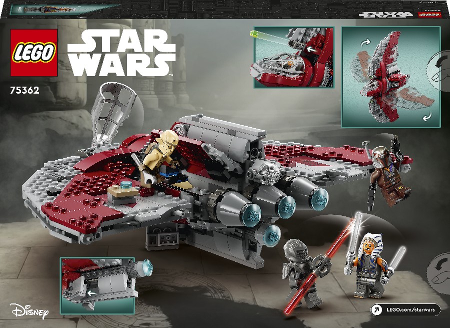 brick-built recreation of Ahsoka Tano’s T-6 Jedi Shuttle (75362). This buildable starship model features an opening LEGO minifigure cockpit, landing gear that’s easily retracted for flight mode, two stud shooters and two storage compartments for tools and weapons.