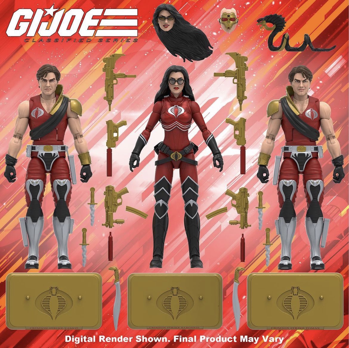 Below you’ll see digital renders for: Shockwave, Helix, General Hawk, Python Patrol Copperhead, Python Patrol Cobra Trooper, Buzzer, Ripper, the Crimson Strike Force (Pulsecon exclusive!), Clutch with the VAMP and the TechnoViper with SMS.