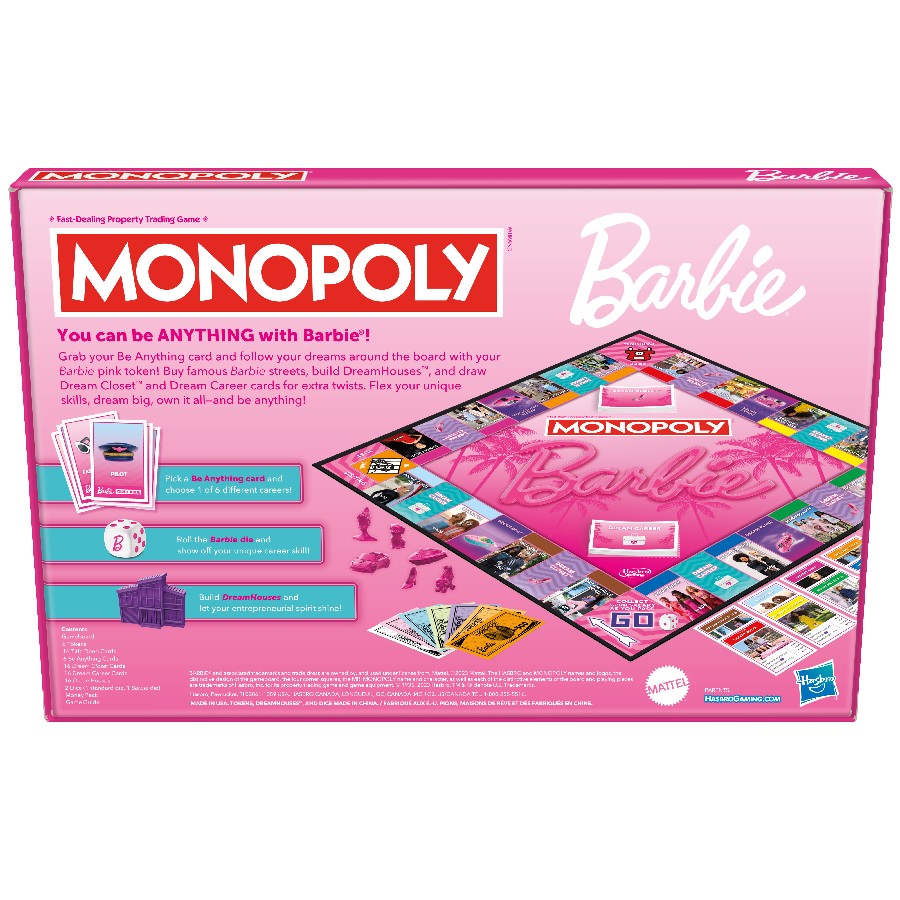 With the Monopoly: Barbie Edition board game, players can imagine slipping into pink Barbie shoes as they follow their dreams to own it all! First, players choose from 6 Barbie-inspired zinc tokens in her signature color, pink: Dog, Show, Sportscar, Speedboat, Roller Skate, and Barbie herself. Then, each player selects a Be Anything card to choose from 6 Barbie careers before they travel the board and purchase famous locations in the Barbie dream world and build their own DreamHouses. If they roll a “B” with the Barbie die, they can flex their unique Be Anything skill, giving them an edge over opponents. Live out career and fashion goals by drawing Dream Career and Dream Closet cards. With convertibles, campers, cute pups and more, you can own it all, express yourself, and live your dreamiest dream with MONOPOLY: Barbie Edition!