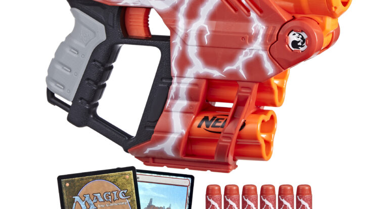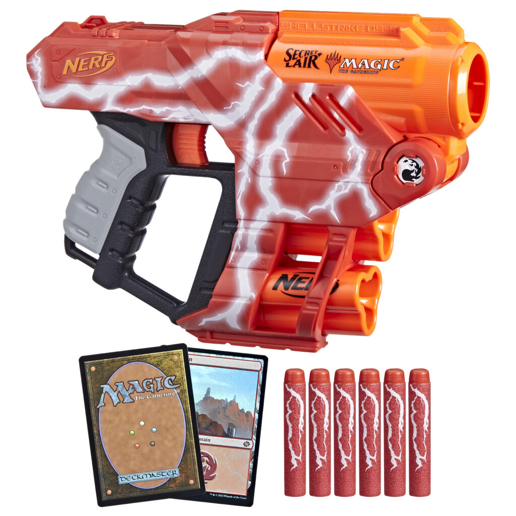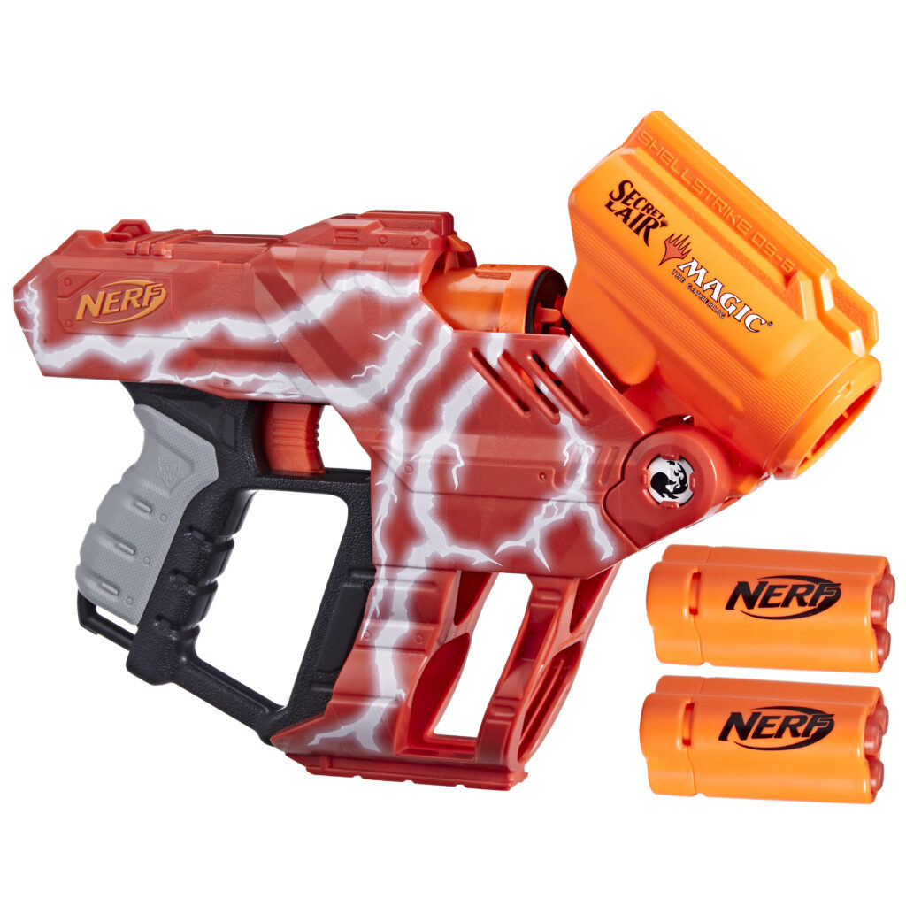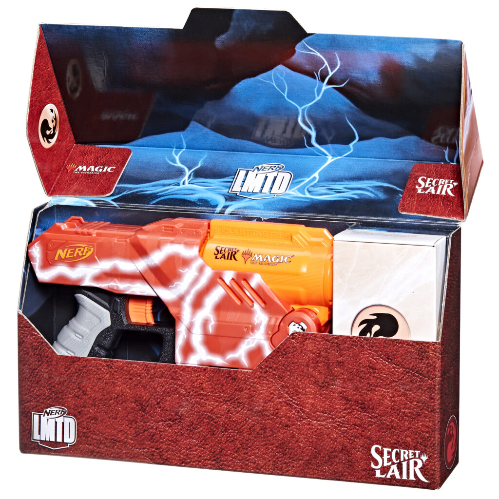 NERF teamed up with MAGIC: THE GATHERING’s experimental sub-brand Secret Lair to bring NERF and Magic fans this special edition NERF blaster! Inspired by the classic art from these cards, NERF LMTD Lightning Lair blaster features lightning bolt deco, includes 2 exclusive playable Lightning Bolt promo cards and unleashes a triple-dart blast to duplicate the 3 damage dealt by the Lightning Bolt card. The Lightning Lair blaster comes with 2 shells that each hold 3 darts. When you fire the blaster, the shell releases all 3 darts simultaneously. The blaster has a break-open barrel for loading the shell. Press a lever and the barrel swings open, load a shell inside, and manually swing the barrel up to close. Prime with the pull-back handle on the rear of the blaster and pull the trigger to send a dart flying!