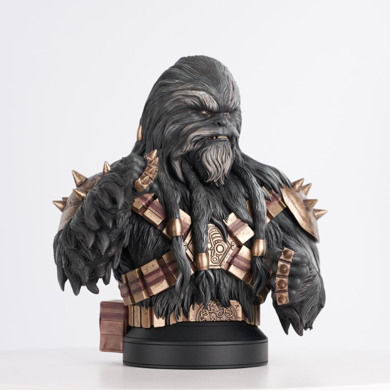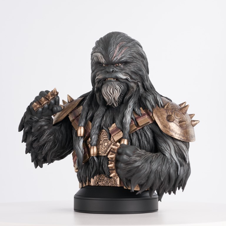 A Gentle Giant LTD release! Let the Wookiee win! Your chances of victory in any battle are increased tenfold when you have a Wookiee on your side, and the black-furred Krrsantan proves the rule. A former gladiator employed by the Hutts, Krrsantan came over to Boba Fett’s side and aided in the defense of Mos Espa from the Pyke Syndicate. This approximately 6-inch resin bust features detailed sculpting and paint applications, and is limited to only 1000 pieces. It comes packaged with a numbered certificate of authenticity in a full-color box. SRP: $150.00