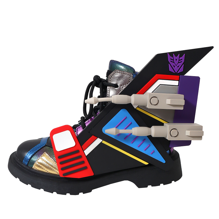 · MORE THAN MEETS THE EYE: There’s ”…More Than Meets The Eye” with these TRANSFORMERS themed ankle boots! Inspired by the scheming Decepticon Starscream, they feature a removable jet wing on the side of the boot, emblazoned with the Decepticon logo. Once converted these lightweight boots are an 80’s colour layering dream! Lace them up and join the battle!