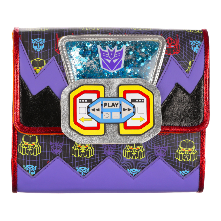 · MUSIC TO MY EARS BAG: A retro Soundwave inspired TRANSFORMERS bag that can also be worn as a handbag or a clutch, and features an awesome glitter filled gel pouch on the front – along with casette tape controls. The 80’s arcade game inspired pattern includes Autobot and Decepticon logo pixelart! Undo the magnetic popper fastening to reveal the contrasting plush orange lining and a handy inside pocket.