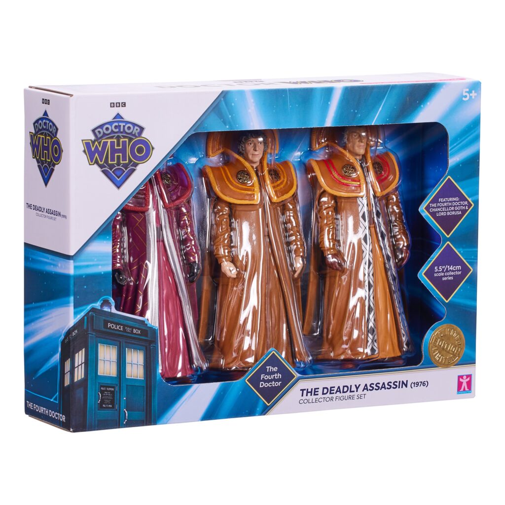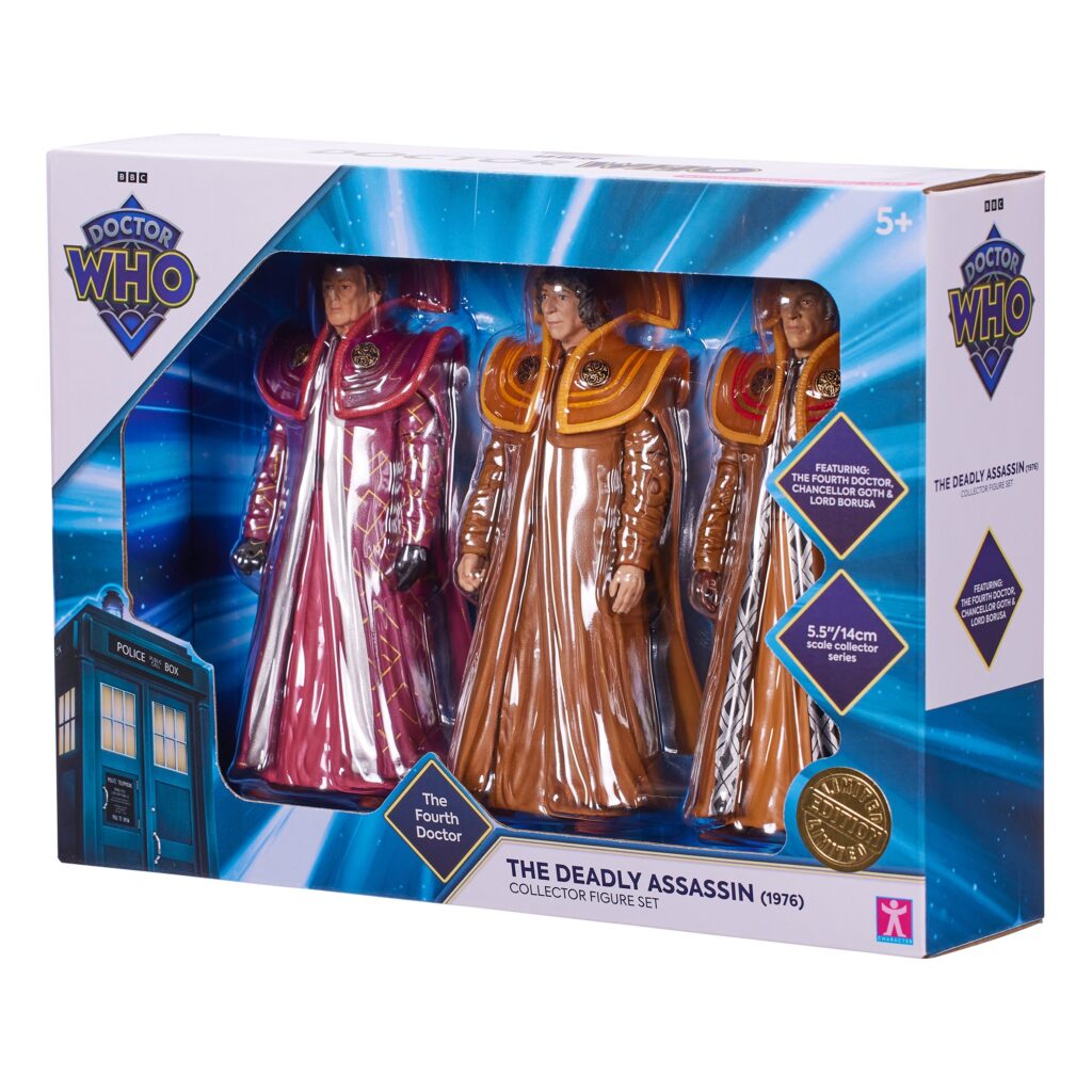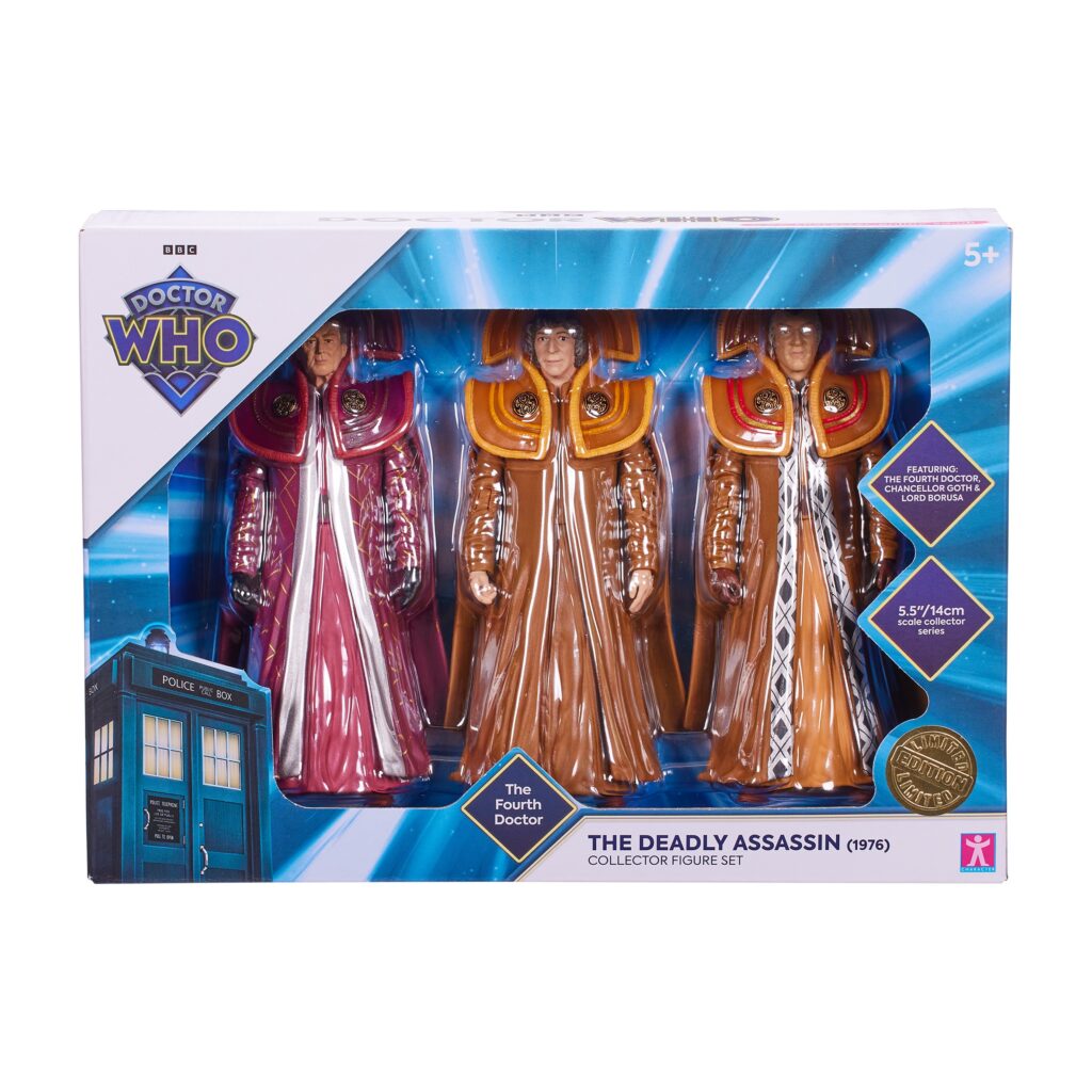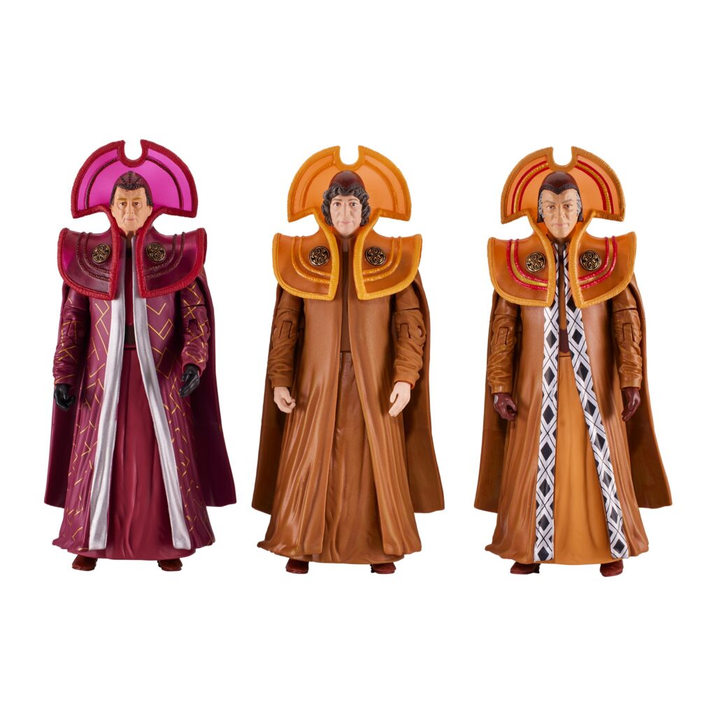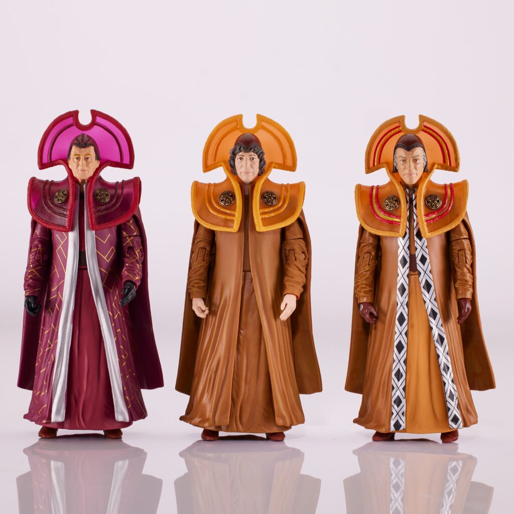 This figure trio features the Fourth Doctor in Time Lord robes, collar and skull cap, Chancellor Goth in