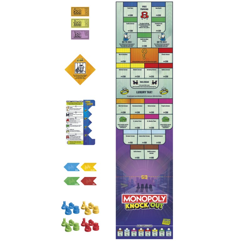 MONOPOLY Knockout is the family party game of sliding tokens and cash-grabbing fun! In this up-and-active version of MONOPOLY, players compete against opponents in a token showdown! Players play in rounds, taking turns sliding their tokens down the 3-foot long gameboard and trying to land them on properties. So aim and slide carefully because you can either collect cash or be forced to pay up based on where your token ends up!