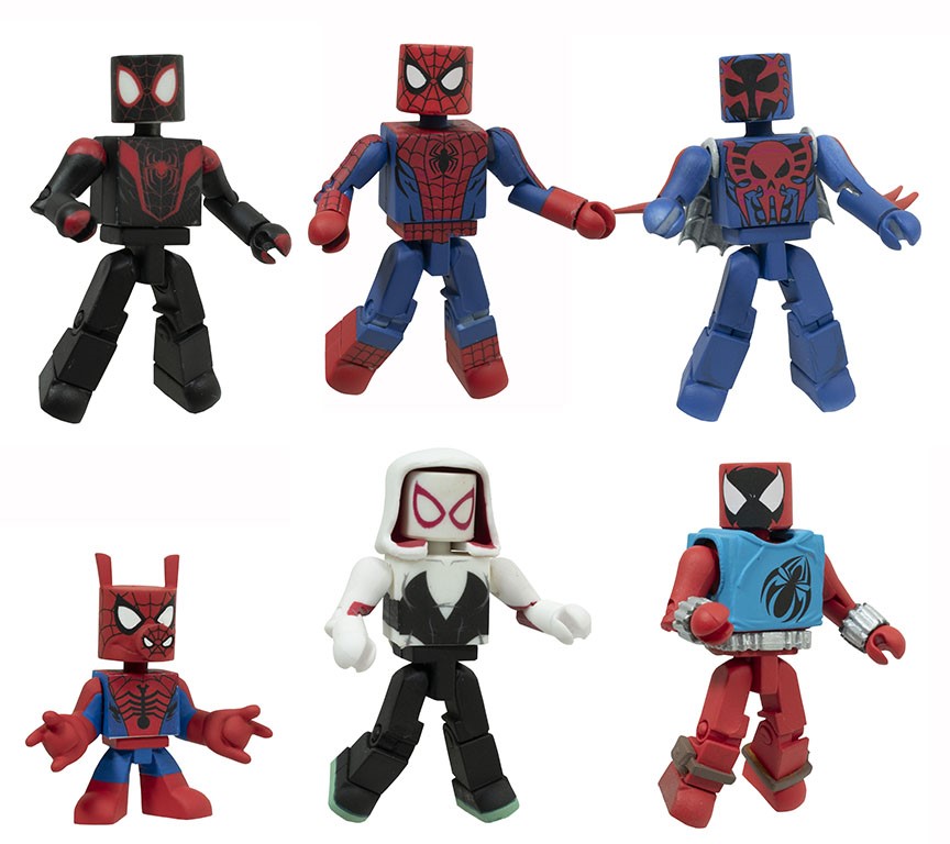 A Diamond Select Toys release! Before the movies, Spider-Man took a trip into the Spiderverse in Marvel Comics, and a new world of Spider-beings was opened up! This all-new box set of Marvel Minimates features six Spider-types, including Spider-Man, Miles Morales, Ghost Spider, Ben Reilly, Spider-Man 2099 and Spider-Ham! Each 2-inch Minimate features 14 points of articulation and fully interchangeable parts and accessories; Spider-Ham is a non-poseable figurine. All six come packaged in a full-color window box with a fifth-panel door featuring original artwork. Designed and illustrated by Barry Bradfield! SRP: $39.99