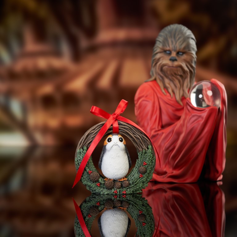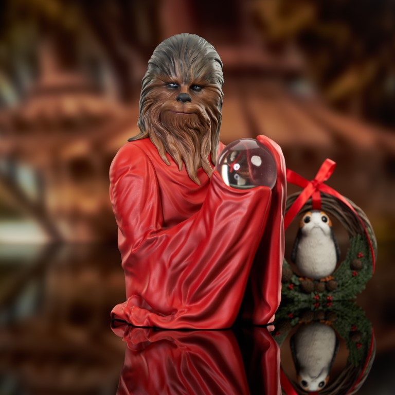 A Gentle Giant LTD release! As the holidays approach, a Star Wars fan’s thoughts turn to Life Day, the ancient Wookiee celebration of family, joy and harmony, which spread across the galaxy in the wake of the Galactic Empire’s defeat. Wearing his Life Day robes and holding a crystalline Life Day Orb, Chewbacca is ready to celebrate, and even brought a friend, a porg perched on a festive wreath. This Premier Guild-exclusive holiday mini-bust set measures approximately 7 inches tall, and comes packaged with a numbered certificate of authenticity in a full-color box.