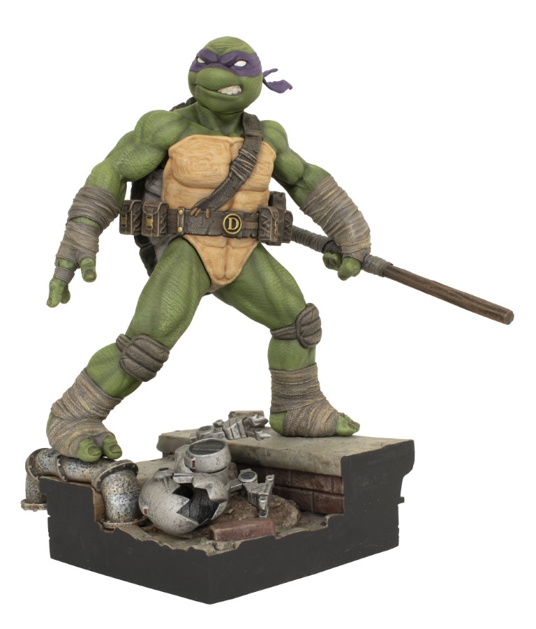 A Diamond Select Toys release! Complete the four! Joining Leonardo, Raphael and Michelangelo, the Ninja Turtles’ resident tech-head Donatello is the last to join the team! Now you can complete your TMNT display, either by lining them up or joining them together in a rooftop configuration! Measuring approximately 10 inches tall, this sculpture is made out of high-quality PVC and comes packaged in a full-color box. Designed by David Forrest of Kinetic Underground, Inc., and sculpted by Sandro Luis Sampaio! SRP: $75.00