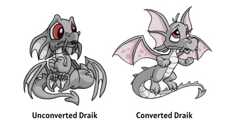 Historically, unconverted (UC) pets, which retain old artwork from before the introduction of pet customisation, have been the most coveted pets in Neopia. In early 2007, Neopets introduced a new “converted” art style for users’ pets that would allow them to wear clothes and accessories purchased in the newly launched Neocash (NC) mall. Many were converted automatically, but some users were given