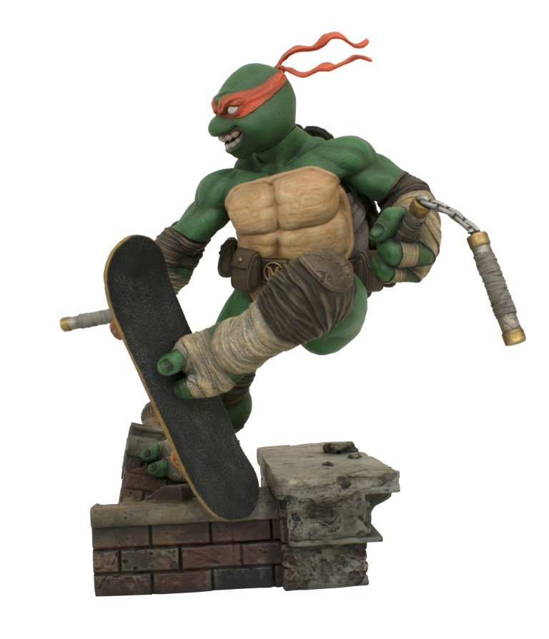 A Diamond Select Toys release! It’s party time! The third turtle to join the Teenage Mutant Ninja Turtles Gallery Diorama line is none other than the party dude himself, Michelangelo! Spinning his nunchuks while doing a trick on his skateboard, Michelangelo stands approximately 9 inches tall and features detailed sculpting and paint applications. Made of high-quality PVC, it comes packaged in a full-color window box. Designed by David Forrest of Kinetic Underground, sculpted by Sandro Luis Sampaio. Coming soon: Donatello! SRP: $75.00