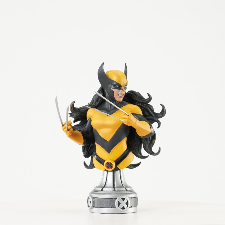 A Diamond Select Toys release! Like father, like clone! The all-new Wolverine gets an all-new bust in the 1/7 scale mini-bust line from DST! Laura Kinney, a.k.a. X-23, wears her new comic-based Wolverine costume and flashes her twin claws in this beautiful new 6-inch-tall sculpture, atop an X-Men logo base. Limited to only 3000 pieces, it comes packaged in a full-color box with a numbered certificate of authenticity. Designed by Nelson X. Asencio, sculpted by Juan Pitluk! SRP: $90.00