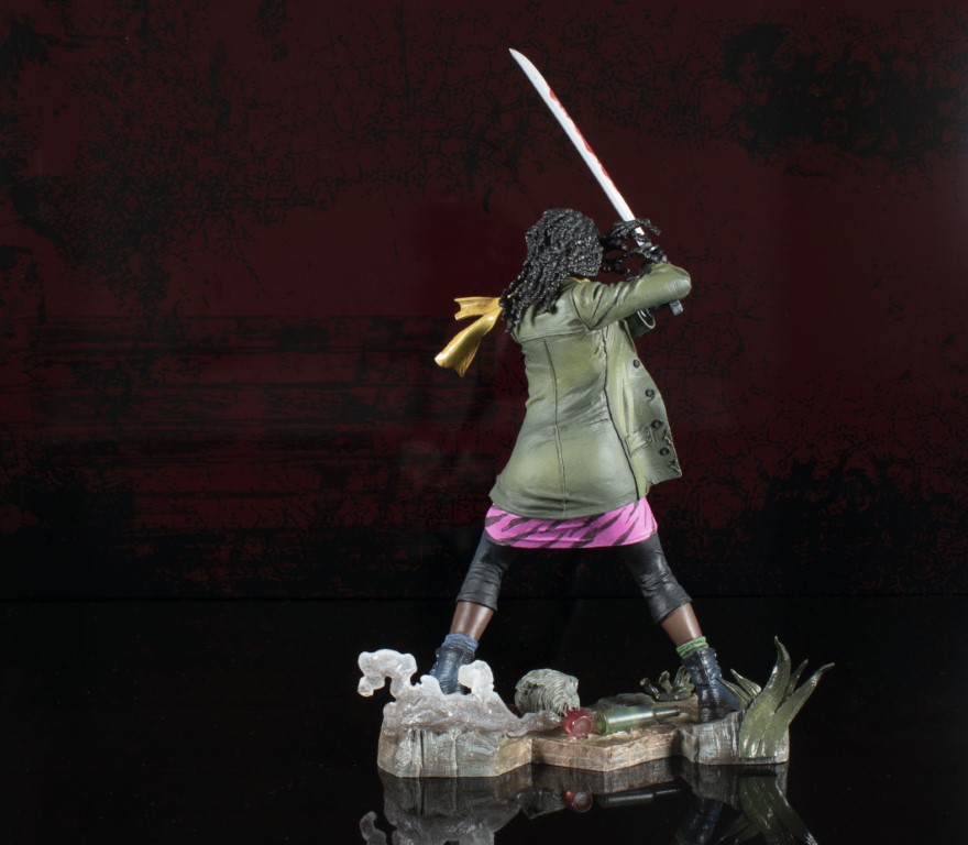 A Diamond Select Toys release! Dead or alive, you’re no match for Michonne! The Walking Dead heroine is now the first in a series of Gallery Dioramas based on the original comic book! Wearing her distinctive jacket and pink skirt, while brandishing her trademark sword, Michonne stands over a sliced walker head in this approximately 10-inch PVC sculpture. Featuring detailed sculpting and paint applications, it comes packaged in a full-color window box. Hand-sculpted by Jean St. Jean. SRP: $59.99