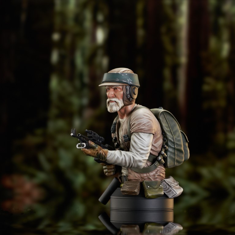 One is a 1/6 scale resin mini-bust of Nik Sant, the white-bearded Rebel Trooper who took on the forces of the Empire in Return of the Jedi. Measuring 6 inches tall atop a black pedestal base, this bust depicts the mysterious rebel with his rifle raised and features detailed sculpting and paint applications. Limited to 1,000 pieces, it comes packaged in a full-color box with a numbered certificate of authenticity.