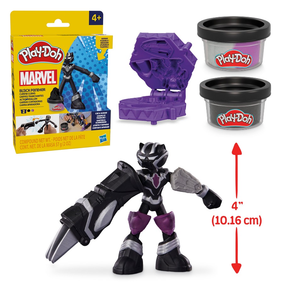 Stamp, slice and squish. Dive into thrilling showdowns with Venom and Spider-Man, unleashing the power of PLAY-DOH and save the day. Mold armor onto Iron Man and activate sound effects and lights for an immersive experience like never before. Slash through obstacles and capture villains with Black Panther’s cutting claws. The possibilities for heroic adventures are endless with the PLAY-DOH Marvel Collection, activating girls and boys creativity within the Marvel Universe.