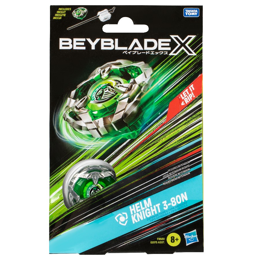 Experience the thrill of the next generation of BEYBLADE stadiums, launchers and tops: BEYBLADE X with the BEYBLADE X Helm Knight 3-80N Starter Pack which includes 1 right-spinning Defense Type top and launcher (Beystadium required, sold separately). Launch right into battle or reconfigure the interchangeable blade, ratchet, and bit of this Starter Pack with those of other BEYBLADE X tops (sold separately) to create your own unsurpassable Bey. BEYBLADE X features the X-Celerator Gear System innovation to level-up your game. When the gear of a BEYBLADE X top engages the rail of the Beystadium arena, it can super-accelerate into an Xtreme Dash rocketing it around the stadium for crushing collisions and epic bursts. Bladers launch their tops intdro fierce clashes against their opponent’s scoring points with each confrontation – first to score 4 points wins. Hasbro BEYBLADE toys with authentic Takara Tomy die-cast metal tops make great kids gifts for boys and girls ages 8 and up.