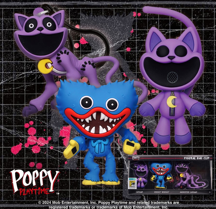 Today Monogram International announced their latest SDCC Exclusive, a set of 3 3D foam bag clips from Poppy Playtime made in collaboration with Mob Entertainment. This set features Plush Catnip, Huggy Wuggy and Monster Catnap each in Monogram’s 3D foam style. Lifted right from the hit indie horror game, this set is priced at $25 and limited to 300 pieces. You can pick one up at SDCC at Monogram’s booth #3645.