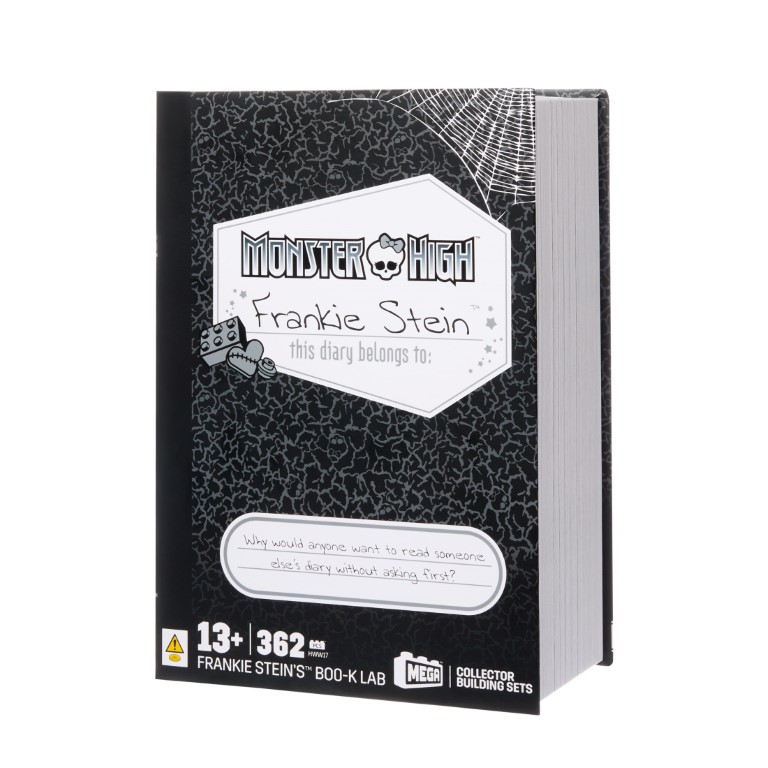 Honor 2010’s iconic first-generation San Diego Comic-Con doll with this 362-piece collectible, featuring a diary book cover and opens to reveal a representation of Frankie’s Laboratory equipped with beakers, flasks, a microscope, and a voltage station, all in a black and white decor.