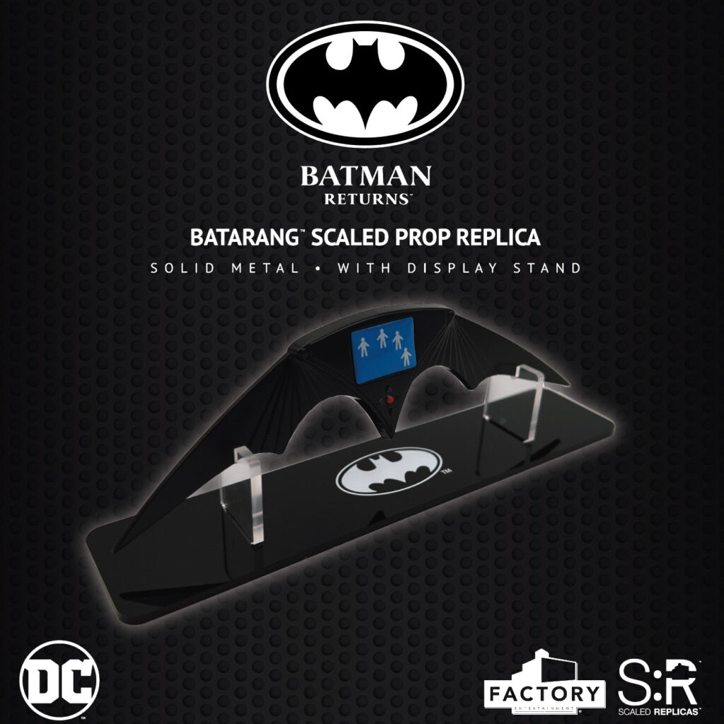 A high quality, officially licensed scaled prop replica of the Batarang from Batman Returns (1992). This stunning 6-inch heavy duty scaled prop replica is cast in solid metal, comes in collector packaging and features a display stand. This scaled replica is priced at $45.