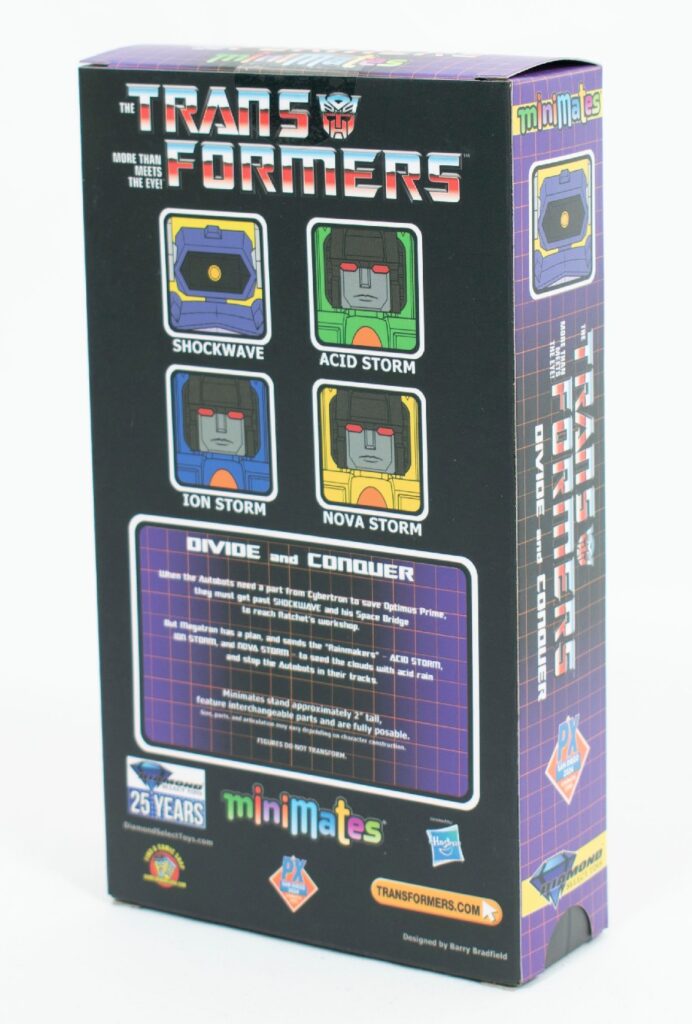 A classic episode of The Transformers comes to life in this all-new box set of 2-inch figures! Decepticon Shockwave and his henchmen Acid Storm, Ion Storm and Nova Storm (also known as the Rainmakers) are more than meets the eye, with over 10 points of articulation each and fully interchangeable parts! With a Minimate-style cover illustration, this full-color “VHS” outer box features a removable “cassette”-style inner box. Limited to only 1000 pieces, it features figure and packaging design by Barry Bradfield!