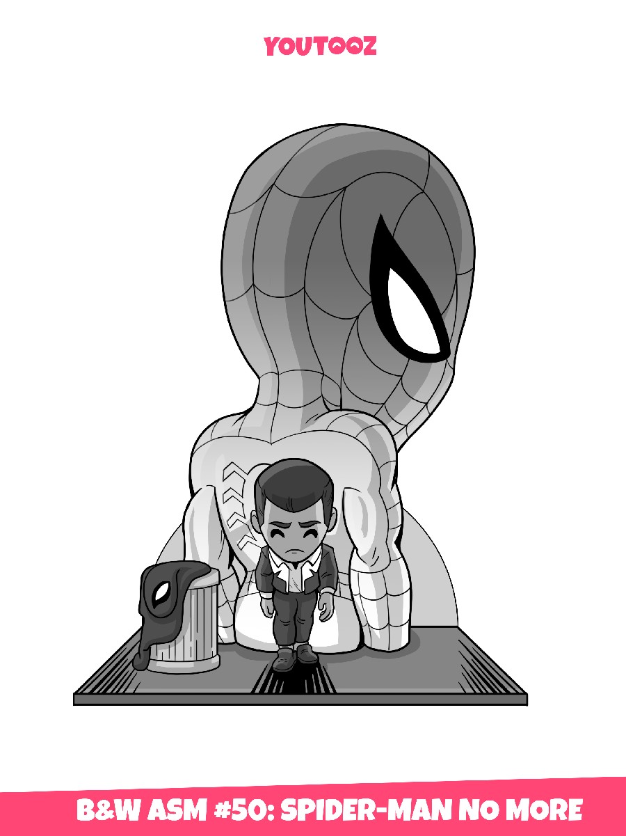 Recreating the iconic Amazing Spider-Man #50, this PREVIEWS Exclusive figure sits at 4.4 inches tall. This emotional figure features a large Spider-Man looking over his shoulder at the disheartened Peter Parker who walks away downtrodden. In contrast with the original, this PREVIEWS Exclusive variant features a nostalgic black and white color scheme. The exterior of the packaging shows a Spider-Man suit stuffed into the trash bin of a rainy alley, while the interior is covered in light grey panels of Marvel comics. This limited-edition collectible ships in a matte, embossed, protective outer sleeve and a custom-sized plastic protector for maximum protection during shipping. Limited to 1000 Pieces.