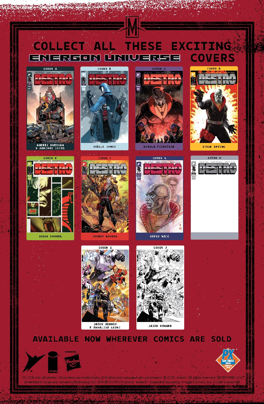 Mini-Series Premiere. The next chapter of The Cobra Threat threat begins here! James McCullen Destro XXIV is the man behind M.A.R.S. Industries, the undisputed leader in providing high-tech weapons to world powers… for the right price. But the emergence of Energon has changed everything. As Destro’s ambitions grow, the “Crimson Twins” Tomax and Xamot Paoli emerge to destroy their competition, and Cobra Commander realizes his current ally could be his future greatest enemy. Acclaimed writer Dan Watters and artist Andrei Bressan change the balance of power in the Energon Universe forever. This exclusive variant cover by Andrei Bressan & Adriano Lucas is limited to 1000 copies.