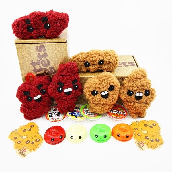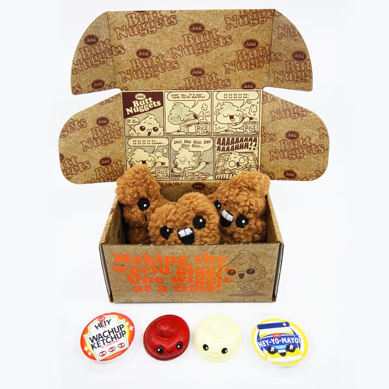 Comes with three huge chunks of world famous Butt Nuggets, Your choice of Original or Spicy. Along with your favorite dipping sauces: Hey-Yo-Mayo, Wachup Ketchup for the original and Waaasaahbiiiiii and Habba Habanero with this new and improved collector’s edition box!