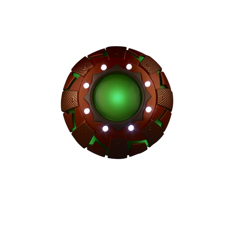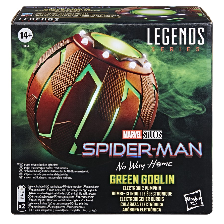 The Green Goblin’s weapon arsenal includes incendiary hand-held devices in the shape of pumpkins. Stored in his glider, they can release enough heat to melt through a three-inch thick sheet of steel. Marvel Legends proudly presents this high-quality electronic reproduction of Norman Osborn’s Green Goblin pumpkin as it appears in Marvel Studios’ Spider-Man: No Way Home. This officially licensed electronic pumpkin features light-up modes by pressing the center button to activate light FX. Press the center button twice to activate a light and sound sequence, featuring the Green Goblin’s signature cackle. Roll the pumpkin for a light-up countdown ending in a blast sound FX. Press and hold the center button for 3 seconds for a 1-minute light display. With movie-accurate sculpting and detailing, this is the next essential Marvel Legends Roleplay item for your Marvel gear collection (additional products each sold separately, subject to availability).
