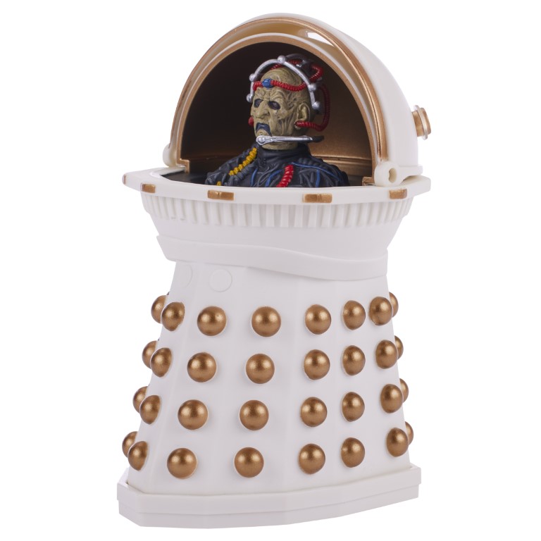 As all fans know, Davros is the creator of the Doctor’s deadliest enemies, the Daleks. In this special set, the evil genius is depicted as in the 1982 episode “Remembrance of the Daleks” partially mutated with one functioning hand, a cybernetic eye mounted on his forehead he is encased in his self-designed cream and gold support chair in place of his lower body – this mobile chair inspired his design of the Daleks.