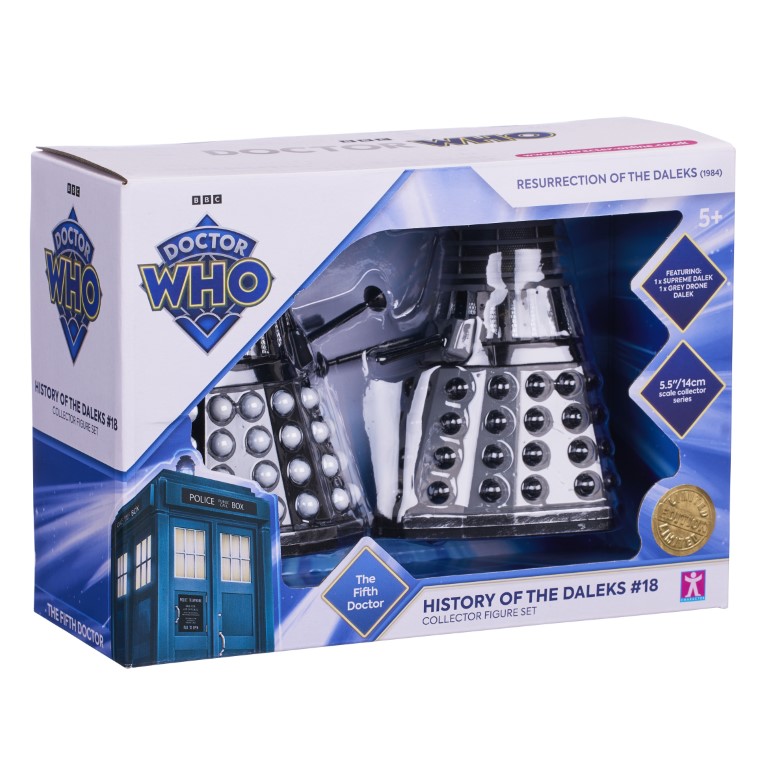 This latest installment for the History of the Daleks series features the black, white and silver liveried Supreme Dalek and a more customary Grey Drone Dalek, from the episode ‘Resurrection of the Daleks’ that first aired in 1984.
