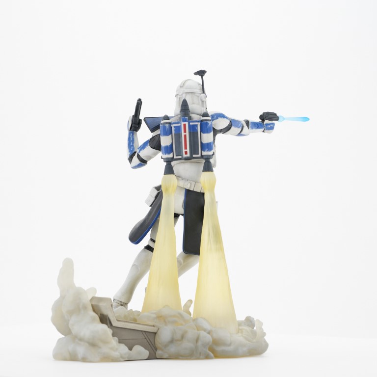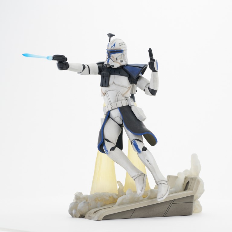 A Gentle Giant LTD release! Captain Rex blasts into action in the newest Star Wars Gallery PVC statue! Lifting off with the thrusters of his jetpack at full power, firing one blaster with his other blaster at the ready, this dynamic statue of Captain Rex is based on his appearance in Star Wars: The Clone Wars, and features detailed sculpting and paint applications. It comes packaged in a full-color window box. SRP: $80.00