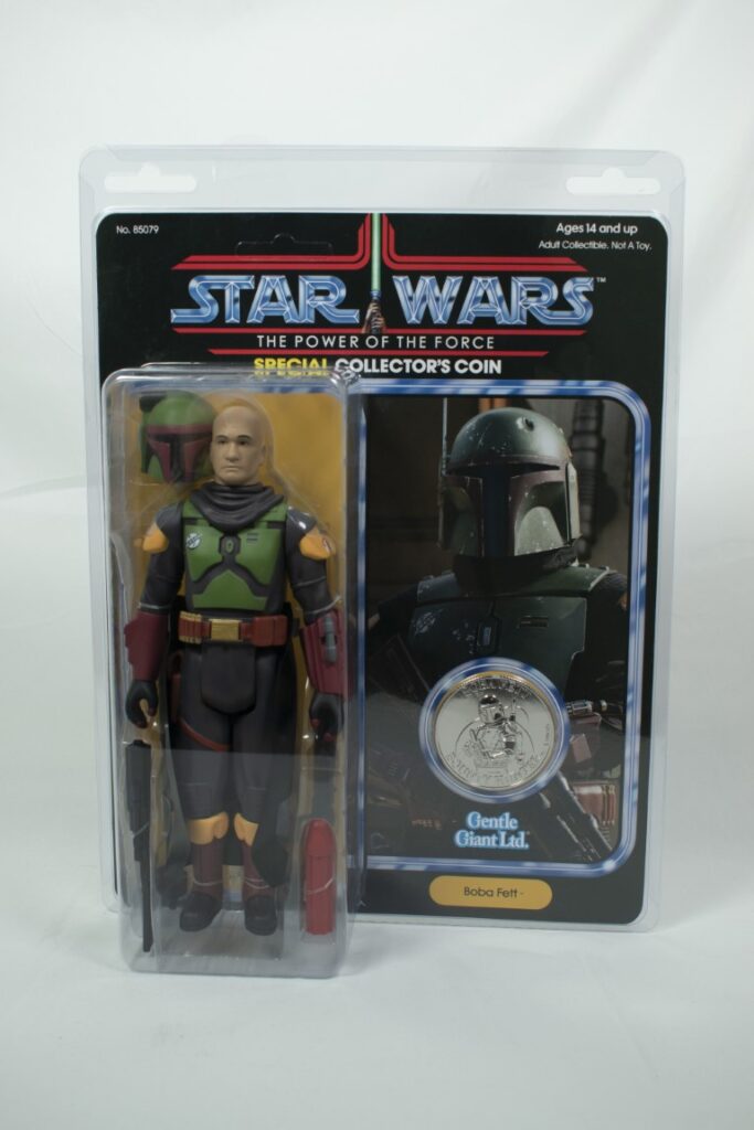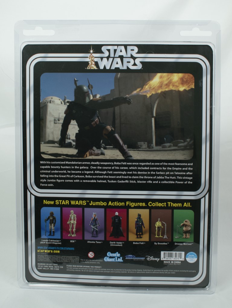 This exclusive 12-inch, retro-styled Star Wars Jumbo figure features a removable helmet and an arsenal of weapons, including a blaster, Tusken rifle and gaderffii stick. Plus his backpack missile really launches, and he comes with a removable vinyl skirt piece for extra authenticity. The figure comes packaged with a chrome collector’s coin on a “Power of the Force” cardback in a resealable blister.