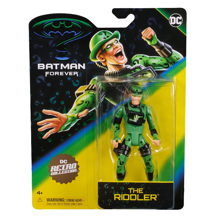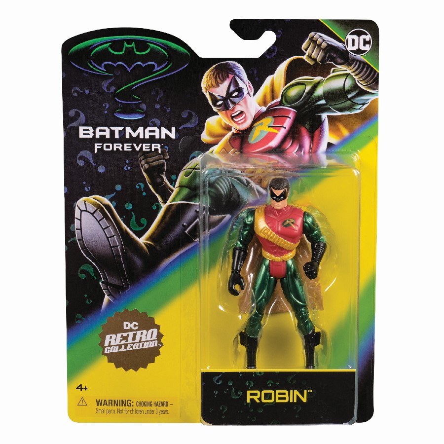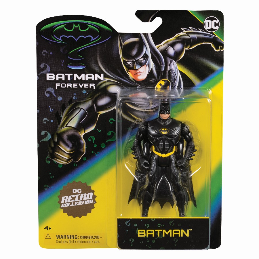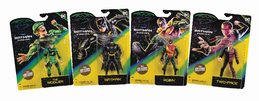 Our friends at Spin Master have sent over details of their Target exclusive collection celebrating 30 years of Batman Forever. This collection includes retro styled figures of Batman, Robin, Two-Face and The Riddler and there’s a 2-piece set featuring the Batmobile with Batman. Full details are below.